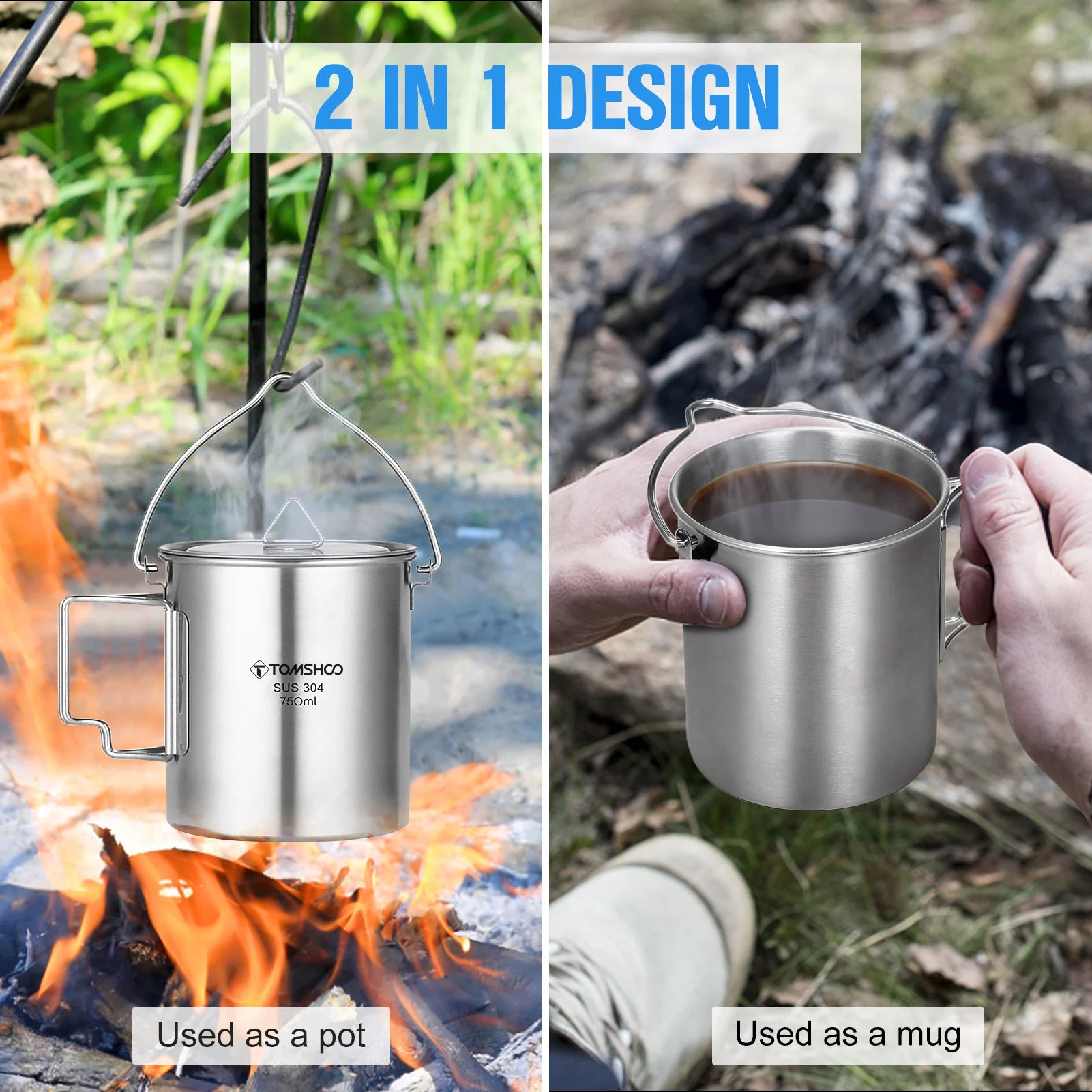 Features: Durable: Includes a 1050ml water bottle and a 750ml hanging pot, both of which are made from stainless steel, BPA-free, corrosion-resistant and healthy. Leak-proof: Threaded cap with silicone ring helps it stay firmly attached and prevents leakage. Big opening makes it easy to add ice cubes or refill water and drinks. 2-in-1 Design: The hanging pot features a bail handle for hanging over the campfire, and the foldable grab handles for easy storage. It can be used as a cooking pot or a water/tea/coffee cup. Suitable for cycling, camping, hiking, running, fishing, backpacking and everyday activities.