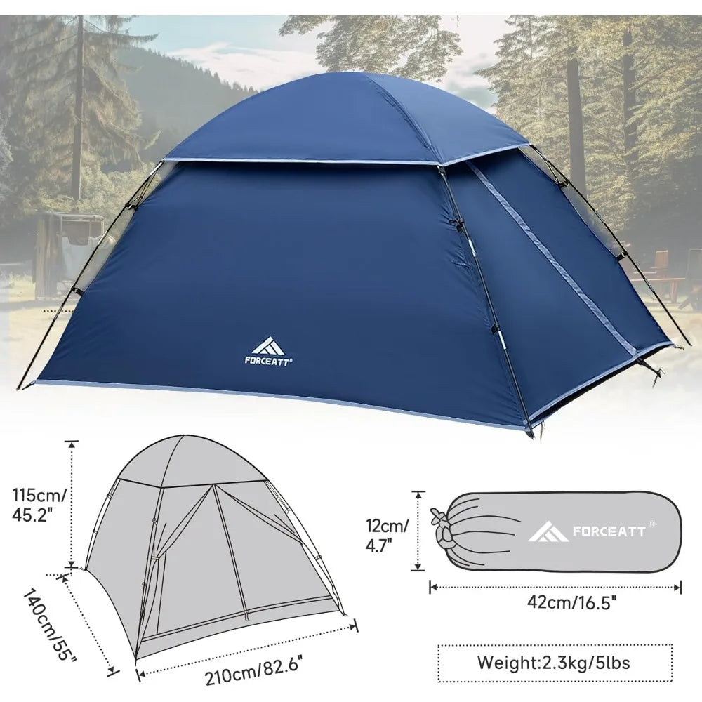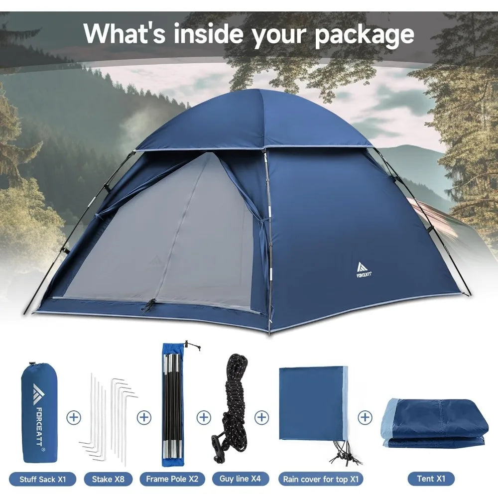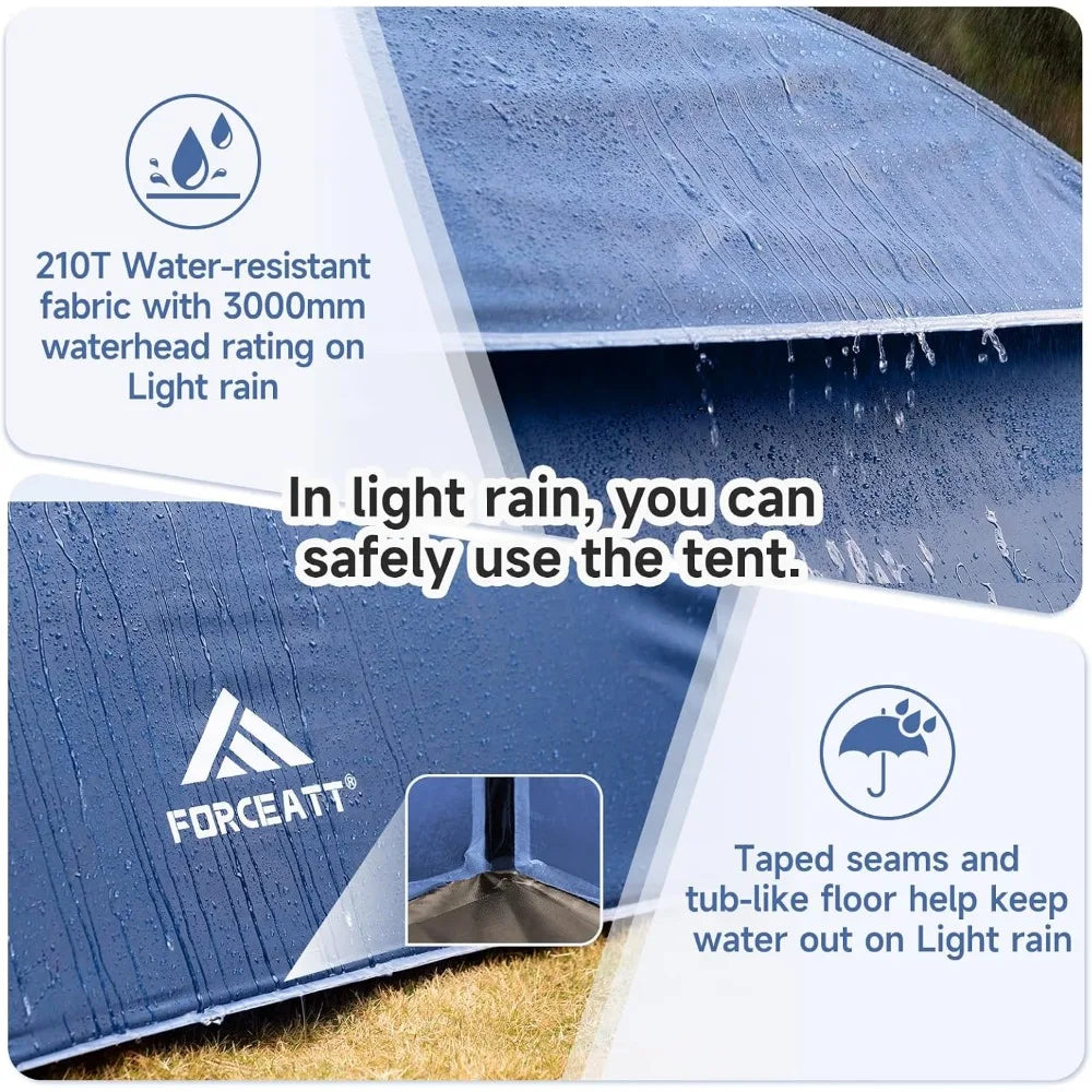 Material & Accessories: Forceatt camping tent equipped with the polyester outer shell, superior glass fiber bracket, 150D Oxford cloth PU3000 in internal proof, 150D Oxford cloth PU5000 in base fabric, waterproof tape on every seam, to ensure the inside dome tent is completely dry under light rain situation. 4 windproof ropes, 8 iron ground stakes make it stable in a windy day.