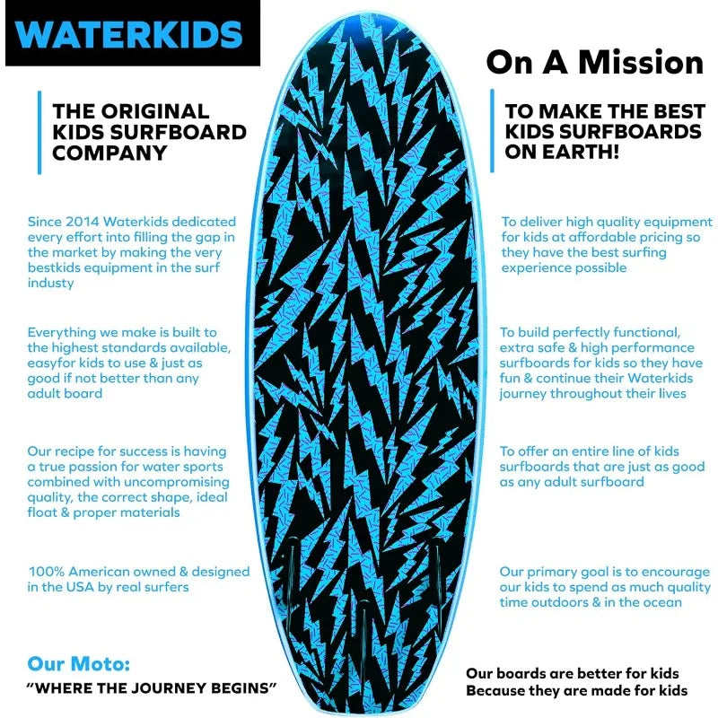 - 🇺🇸 AMERICAN OWNED - Waterkids is 100% American owned all of our boards are designed right here in the U.S.A. by real surfers! Everything we make is specifically designed for kids, built to the highest standards in the surf industry & backed by our award winning customer service. Since 2014 Waterkids has proudly dedicated every effort into making the best kids surfboards, kids paddleboards & accessories on the market. Shop the biggest & best selection of kids surf boards on the planet!