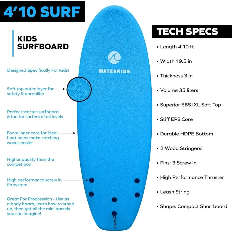- 4’10 KIDS SURFBOARD - Tons of fun packed in a compact size! 4-foot 10-inch soft top surfboard made for kids. All of our surfboards are specifically designed for kids and are built to the highest standards in the surf industry. Ideal beginner surfboard & fun for all skill levels, age ranges, children, teens & even adults! Perfect for learning how to surf. Remove the fins & use as a body board or boogie board. The ultimate beach toy!