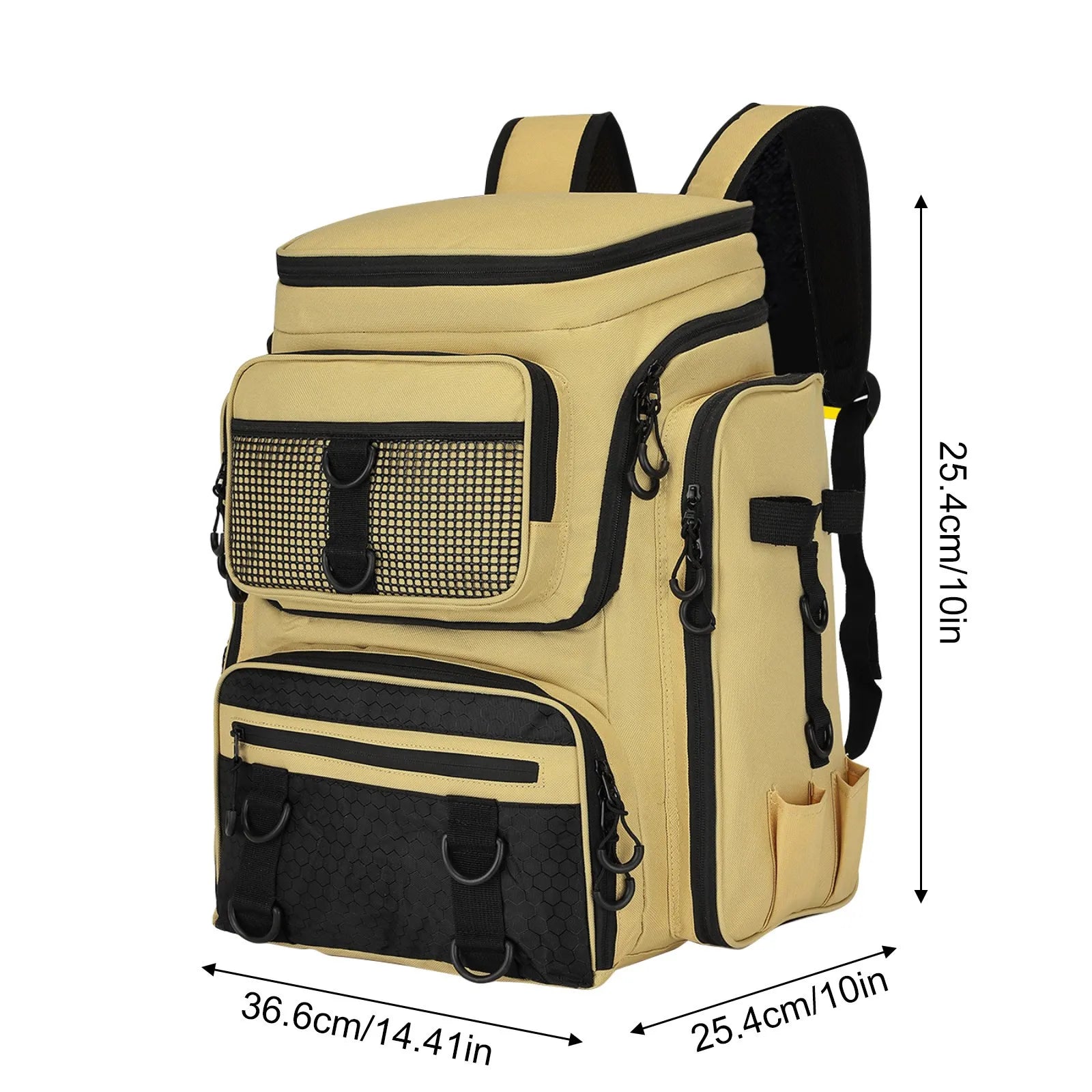 - Large Backpack with 16 Storage Pockets - The fishing backpack has a large 42-liter storage space to accommodate all the you need for a day of fishing. Dimensions: 36.5 x 25.5 x 45.7 cm. This fishing tackle backpack contains 16 separate pockets and storage areas, providing ample space to store all your fishing gear and accessories, such as fishing rods, reels, pliers, tackle boxes, fishing tools, controllers, water bottles, etc.