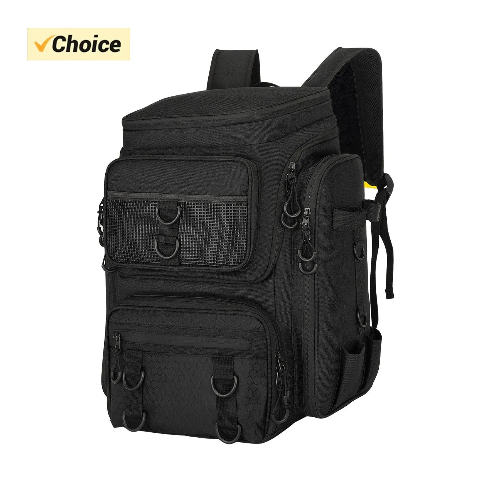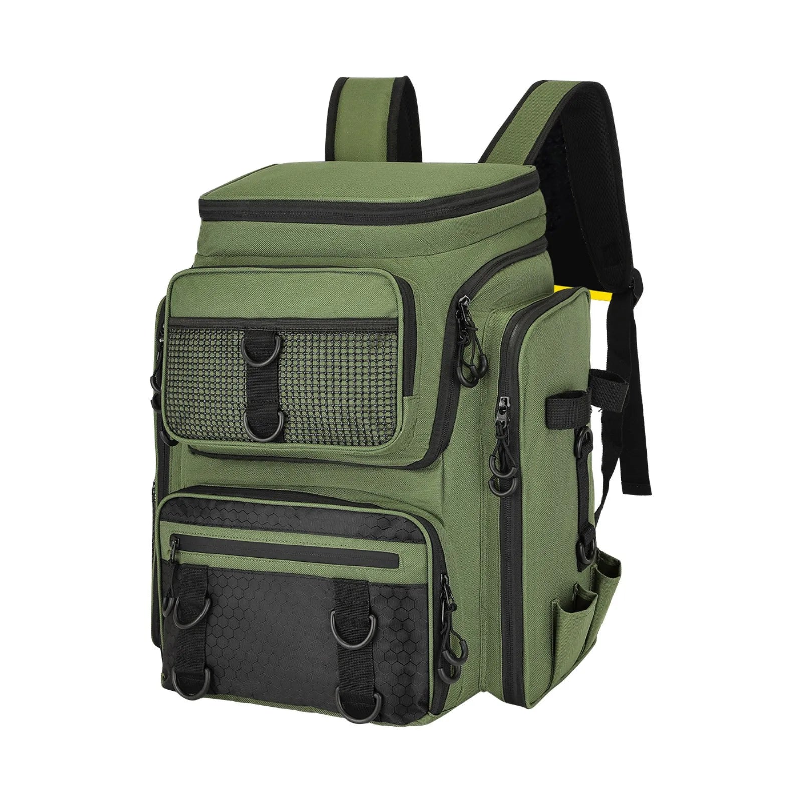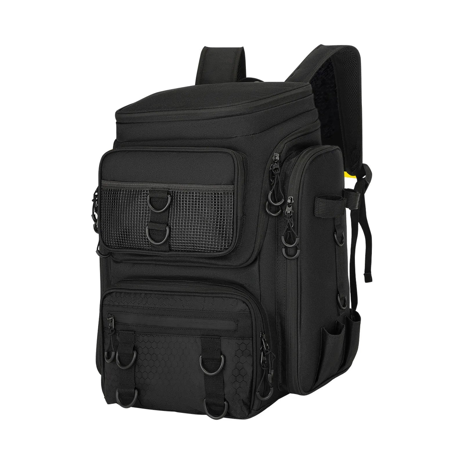 - WATERPROOF AND STURDY - The fishing backpack with rod holder is made of high-density 900D polyester fabric, which is high-performance, reliable all your fishing gear and tackle from damage. The waterproof coating ensures your belongings stay dry. The sturdy zipper structure ensures easy access to each pocket. The sturdy X-shaped stitching at the shoulder straps and backpack connection allows you to carry the fishing bag more safely.