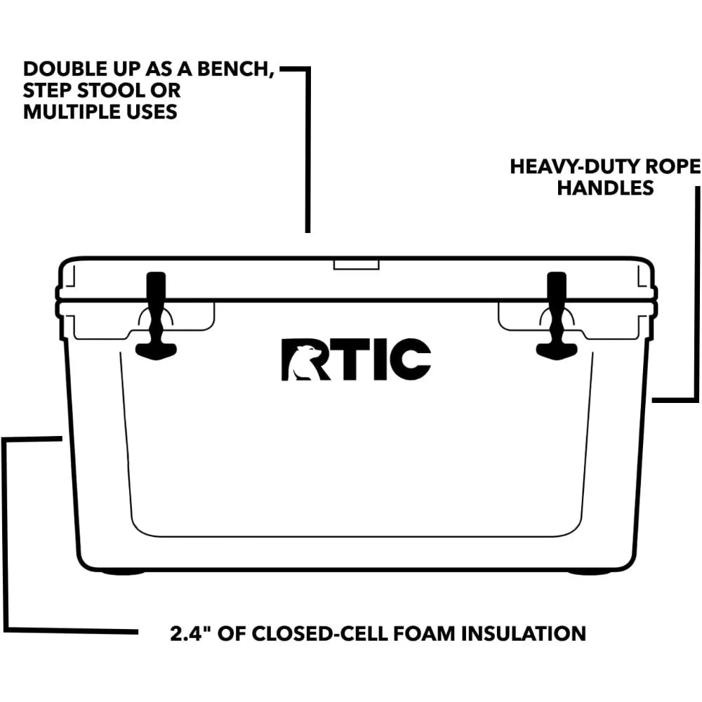 MANY SIZES AVAILABLE – This outdoor cooler comes in 20 qt, 45 qt, 65 qt, 110 qt, and 145 qt sizes. This hard cooler can double up as a bench, step stool or tabletop. Capacity: 65 QT / Up to 84 cans. Measures: 17'' x 31 5/8'' x 17 2/3''; Weight: 37.7.
