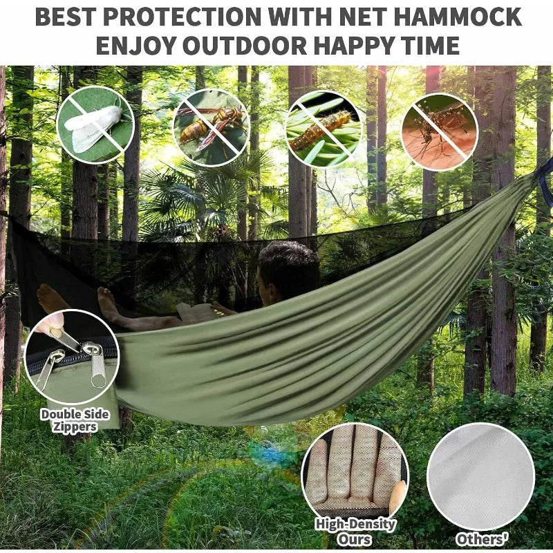 - 【Camping Hammock With Bug Net】The outdoor hammock is designed with a built-in bug net. Small and dense nets effectively stop the bites and harassment of mosquitoes or even the smallest pests. The attached elastic string will help keep the bug net up and away from you. 2-in-1 reversible design, flip the hammock over when you don't need the mosquito net