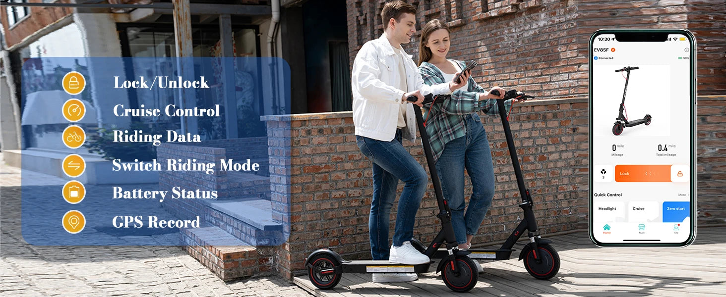 ★E-SCOOTER WITH APP CONTROL: With "EVERCROSS PRO" APP, the EV85F electric scooter can be partially operated through a smartphone. Users can not only lock and unlock the scooter, control speed modes, light, zero-start, cruise control, and other functions, but also use the navigation function and view riding data for each trip.