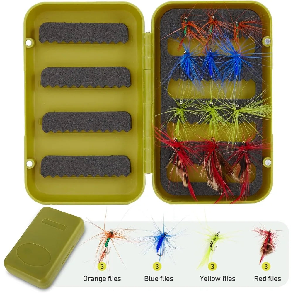 Waterproof & Portable: The hard waterproof case provides protection for the contents, and it comes with a shoulder strap for carrying over the shoulder or by hand. The fly flies kit contains twelve flies in different colors, stored in a portable box