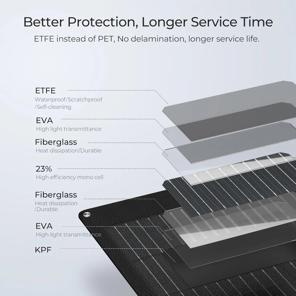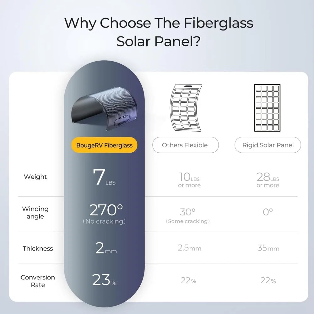 Lightweight and Easy to Carry. Ultra Lightweight-Only 7 lbs and Thin-Only 2mm. The factory uses special lamination technology to make fiberglass flexible solar panels light and thin, leading in the market, and easy to move.