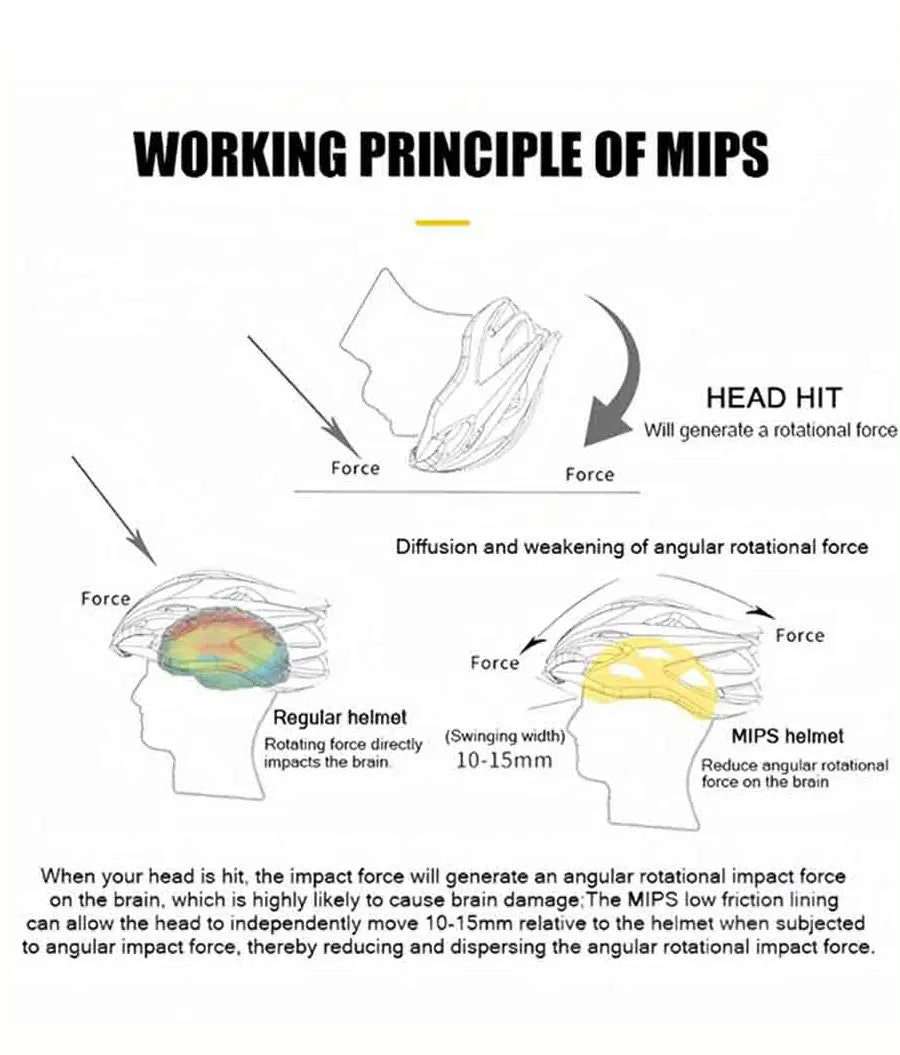 When your head is hit, the impact force will generate an angular rotational impact force on the brain, which is likely to cause brain damage; The MIPS low friction lining can allow the head to independently move 10-15 millimeters relative to the helmet when subjected to angular impact force, thereby reducing and dispersing the angular rotational impact force.