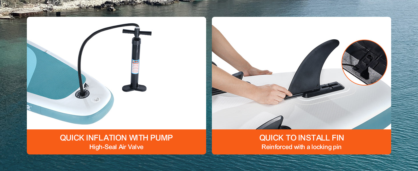 - Convenient and Quick Inflation: Achieve optimal inflation (12-15psi) swiftly with the included high-quality air pump, easily connecting to the air valve for rapid inflation. The pressure gauge allows for precise monitoring. Lightweight and equipped with a strap handle, the paddle boards for adults and youths is effortlessly portable, folding compactly into the provided accessory bag for travel.