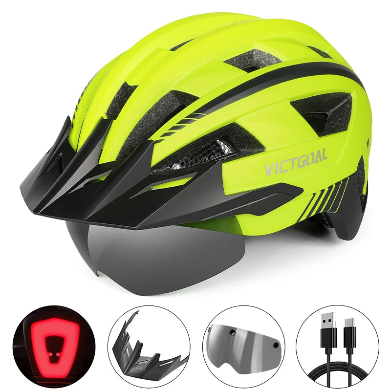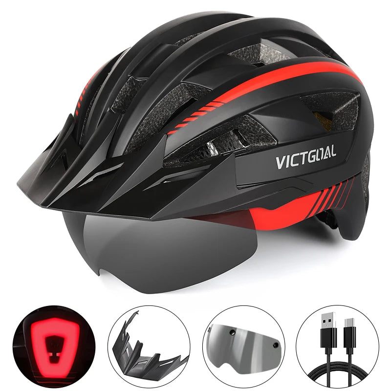 VICTGOAL MTB Road Bike Helmet for Men Women Visor Goggles LED Rear Light Mountain Bicycle Helmet Racing Safety Cycling Helmets
