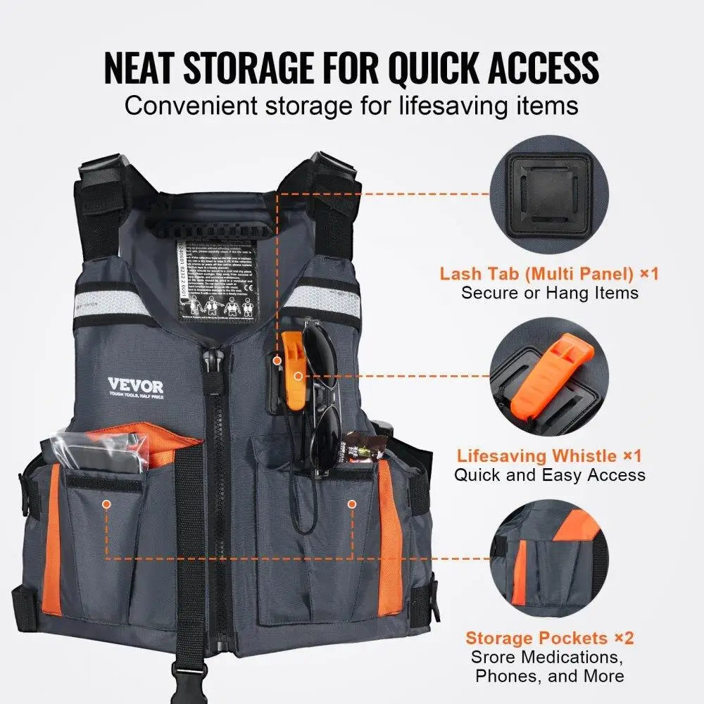 Large Storage Capacity: Two large pockets of life jackets & vests offer ample storage for essentials like wallets, phones, and keys. The chest Lash Tab provides convenient storage for items like whistles and sunglasses, making them easy to access.
