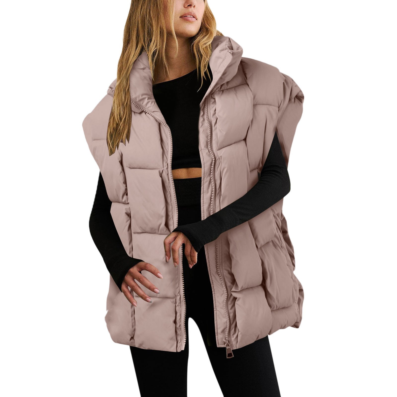 Women's Winter Oversized Puffy Vest Lightweight Stand Collar Flight Sleeves Insulated Padded Puffy Jacket Coat With Pockets